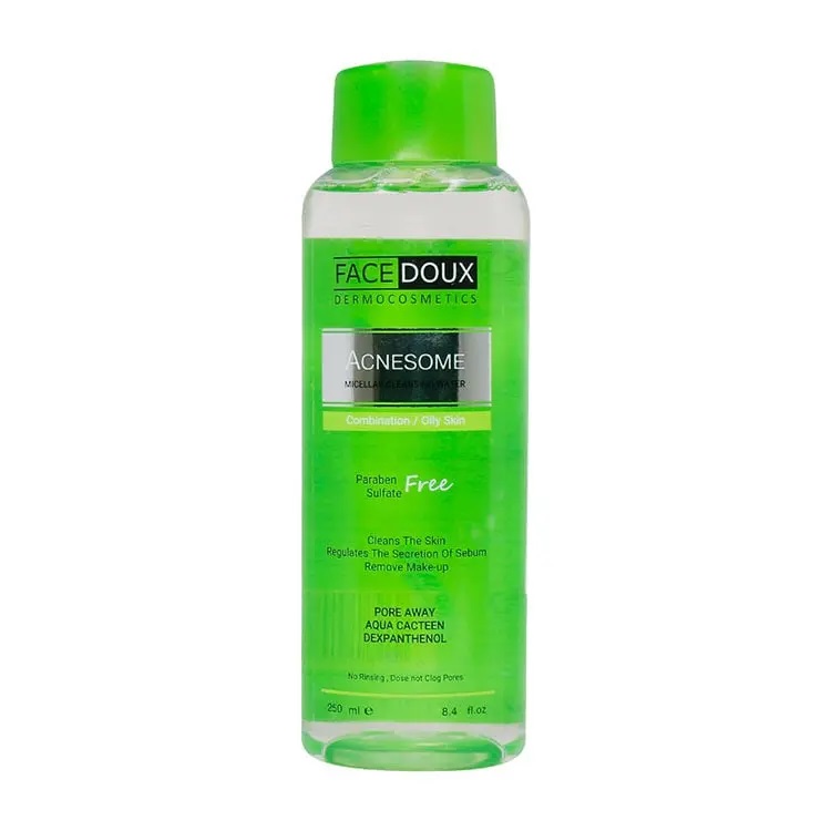 میسلار واتر آکنه زوم فیس دوکس مخصوص پوست چرب محصولی از برند ایرانی فیس دوکس است. این محصول بدون نیاز به آبکشی به خوبی پوست را از هرگونه آلودگی و بقایای لوازم آرایش عاری می سازد. این میسلار واتر دارای pH فیزیولوژیک متناسب با پوست است. میسلار واتر آکنه زوم فیس دوکس حاوی مواد پروبیوتیک بوده که فلور طبیعی پوست را حفظ می کند.